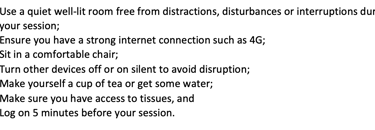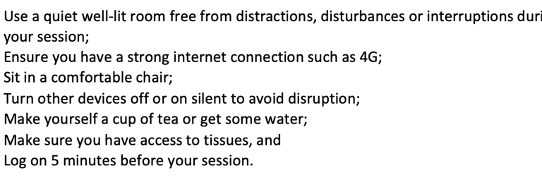 Telehealth sessions will be conducted either by telephone, or video using a platform called doxy.me. A link will be either emailed or sent via sms to you, which can be used on your mobile, tablet or computer, or through an internet browser.